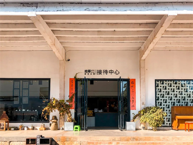 從金鼎山北路14號(hào)下車時(shí),一棟巨大的白色建筑便呈現(xiàn)在每一位來者的眼前。沒有巨大的招牌,“拾翠民藝公園”幾個(gè)白色的字體就這么立在路邊,低調(diào)到不想讓人發(fā)現(xiàn)它一般。穿過地面鋪設(shè)的石板路,走到接待中心跟前細(xì)細(xì)打量——這里還殘留著舊時(shí)工廠的痕跡。