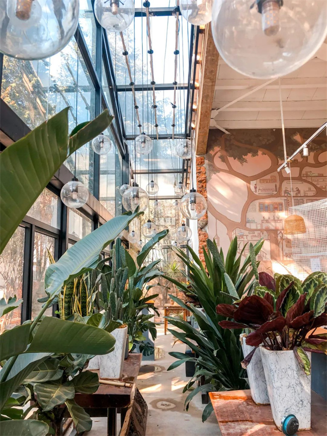 而在展廳的左側(cè),這里仿佛是一片室內(nèi)植物園。吧臺(tái)、吊燈、高腳椅,配合著里面伸出來的枝葉,竟然沒有一點(diǎn)違和感。