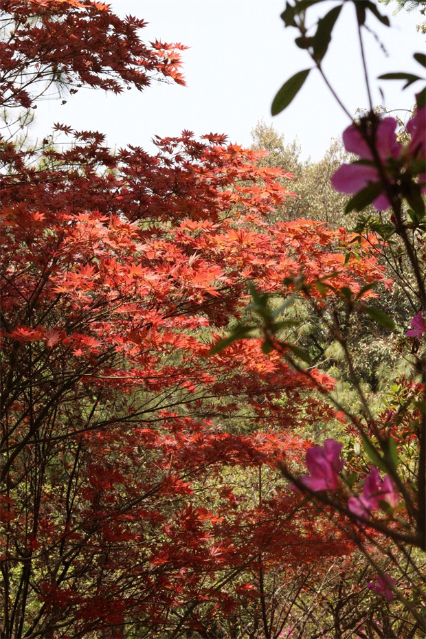紅楓秘境在醞釀驚喜。新生的楓葉浸透了春日的陽光,深淺不一的紅與蒼翠古木交織,史鐵生筆下“生的豪情”在此處具
