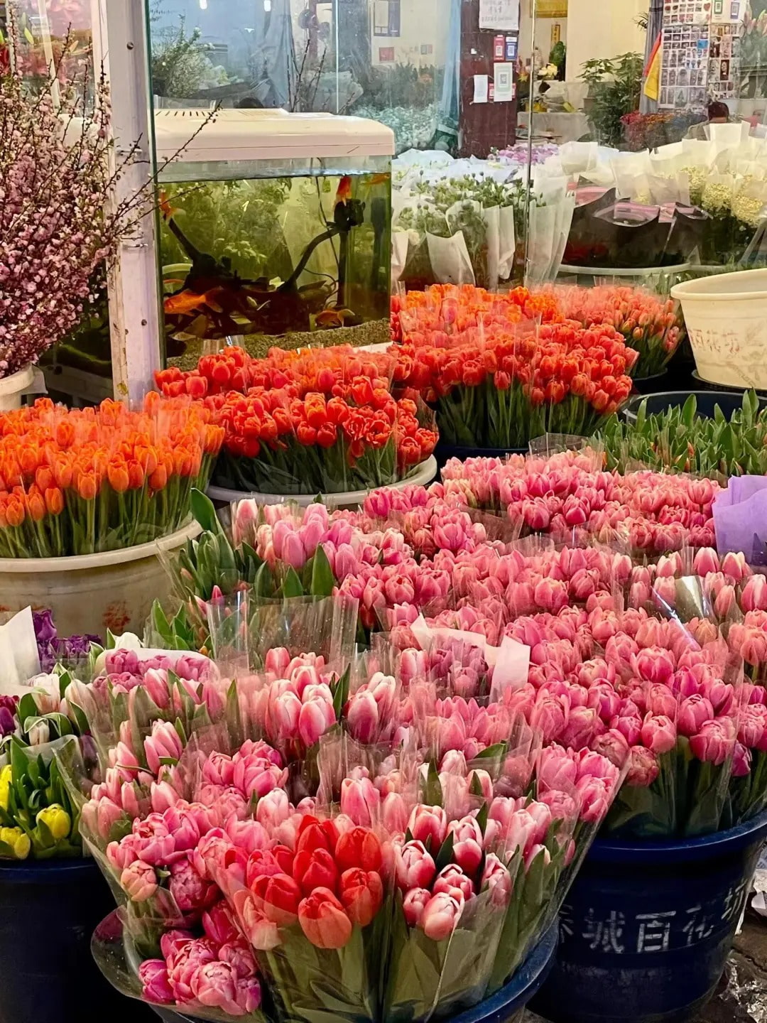 小tisp:玫瑰均價大概5-15 向日葵3-5一束 繡球5-8一朵 多肉10元3盆 郁金香進口40一把