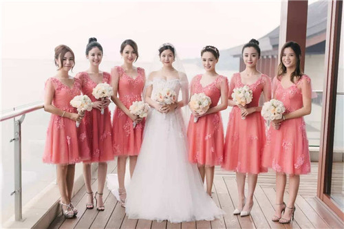 1、在婚禮上,伴娘禮服的顏色不能比新娘禮服顏色更亮,要以暖色為主,如:淡粉色、淡黃色。