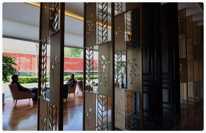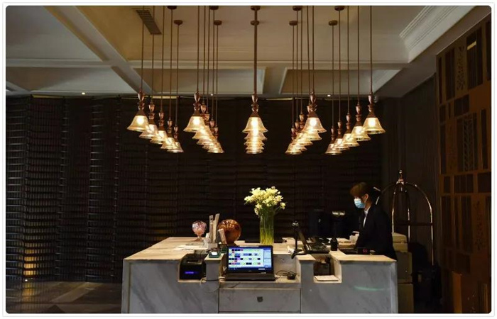 進入酒店,寬敞的大堂,法式簡約的設計風格,特別是大堂墻面編織的“肌理”,讓人聯想到亞洲獨有的竹子編織圖案和米軌之上的枕木。這是一個貫穿全店的“脈絡”,能讓客人立刻與酒店產生共鳴。懸掛于接待臺上方的陣列燈具體現出那個年代火車上的鈴鐺的形態,在新與舊、現代材質與過去形態中找到連接的情感,夢幻而獨特的旅途就此拉開。