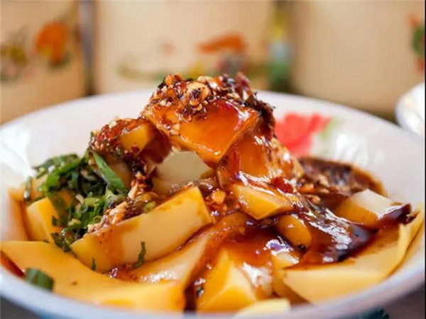 豌豆粉是官渡古鎮夏天里最受歡迎的一款小吃,它是一種以豌豆作為原材料制成的絲滑、透亮、金色的一種食物,充滿豆香原味,看著就能勾起你的食欲。