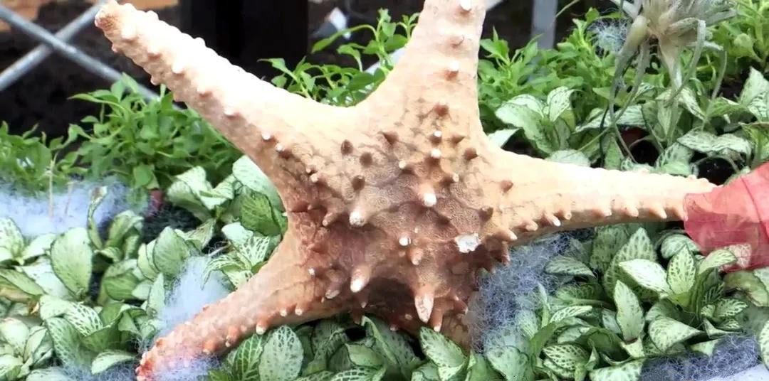 記者:“我身旁的這個(gè)白色的海螺以及一側(cè)的海星都是來(lái)自沿海地帶,那么這些海星其實(shí)并不是一些植物造型,或者是泡沫形成的,這個(gè)是真真切切的一個(gè)海里的生物。那么整個(gè)造型呢,安置在這樣一個(gè)立體花壇上,也是想體現(xiàn)生物、人物、動(dòng)物和植物的一個(gè)共生。