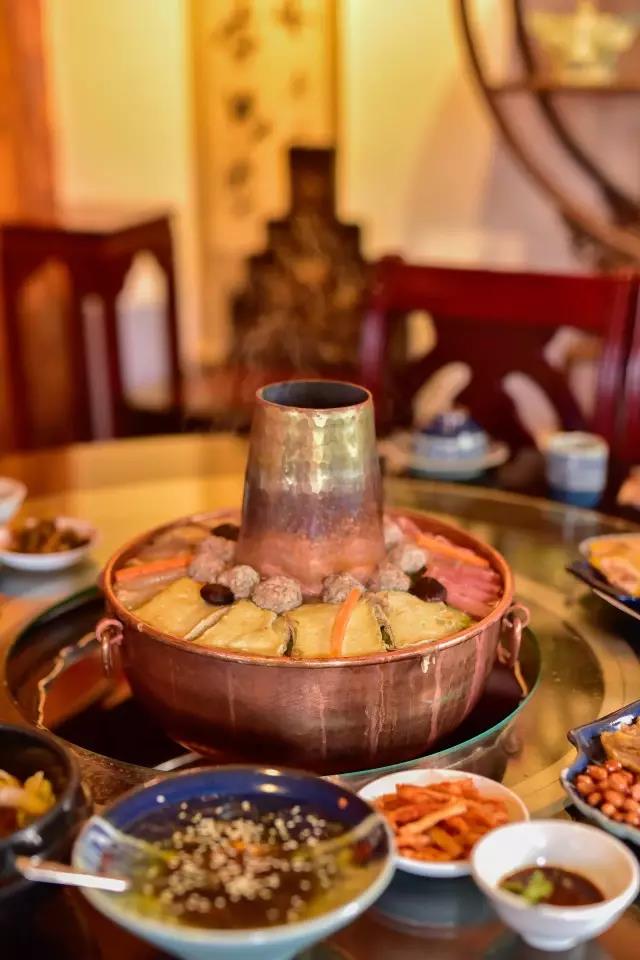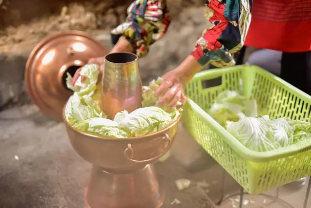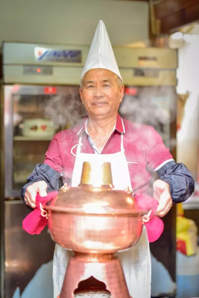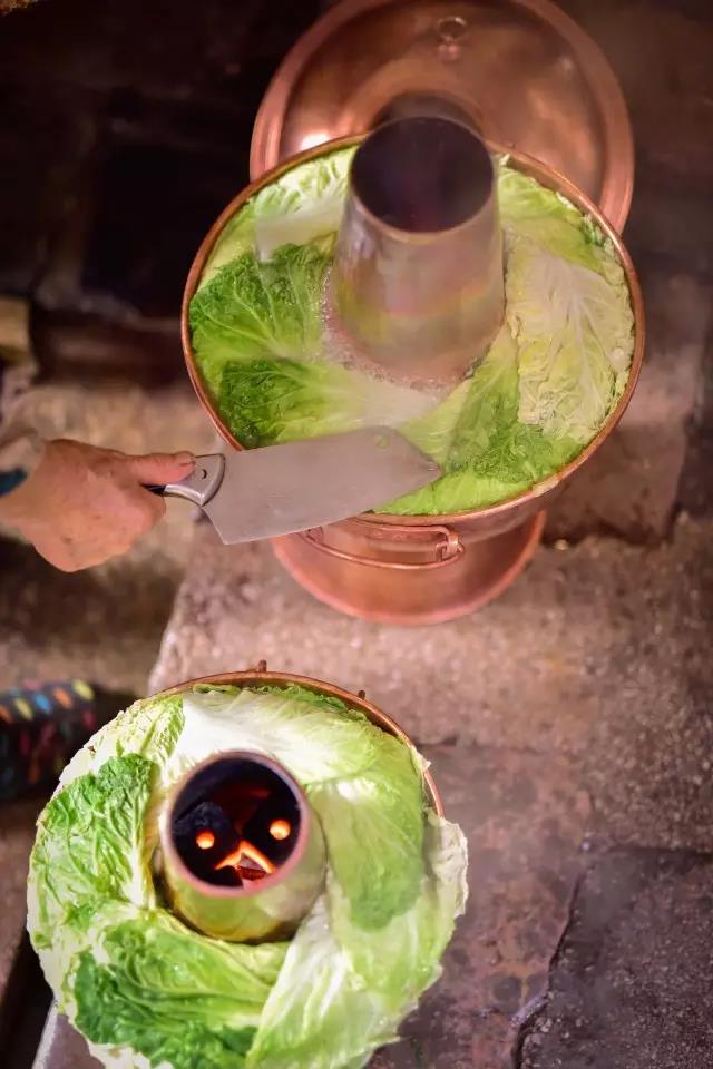 先將熬制好的高湯盛入銅鍋,放入些許鹽、胡椒等調(diào)料,舀入幾勺豬油,蓋上鍋蓋,在煙囪中加入無煙碳生火,等待高湯煮沸。高湯由店主憑借自己幾十年的經(jīng)驗(yàn),獨(dú)家熬制。“放入土雞、排骨、筒子骨、老鴨同煮,水沸之時,拂去沫子,待用筷子能戳穿肉時取肉,再等雞能被戳穿時,取雞,約一小時許,然后再把筒子骨取出,涼后剔肉,肉涼拌或打蘸水食之。此時湯鮮、色白,可謂高湯。古人無味精,故用雞、骨等熬制成高湯,可當(dāng)味精,故而炊鍋一般不放味精,放適量鹽即可。”馬姐告訴我們,熬制高湯用的都是礦泉水。
