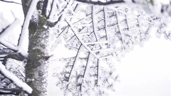 作為中國(guó)緯度較低的季節(jié)性雪山,轎子雪山最高海拔4223米,冬春兩季山頂會(huì)有積雪。樹(shù)梢上掛滿冰渣,樹(shù)枝上結(jié)出“霧凇”。