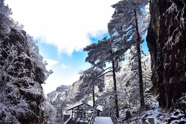 木質(zhì)的棧道上堆滿積雪,轎子雪山上下往來(lái)的纜車(chē)表面也被冰雪所覆蓋,而索道兩旁高大的樹(shù)木銀裝素裹,早已披上了一層積雪堆砌的潔白大衣,讓轎子雪山呈現(xiàn)出別樣風(fēng)采。