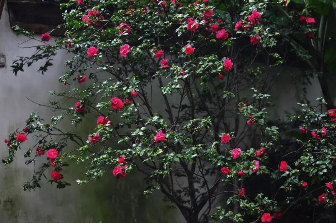首先,星羅棋布于金殿各處的茶梅盛開了。茶梅是每年最早吐蕊的山茶花,枝俏花小,夏天吐蕾,秋日競放。