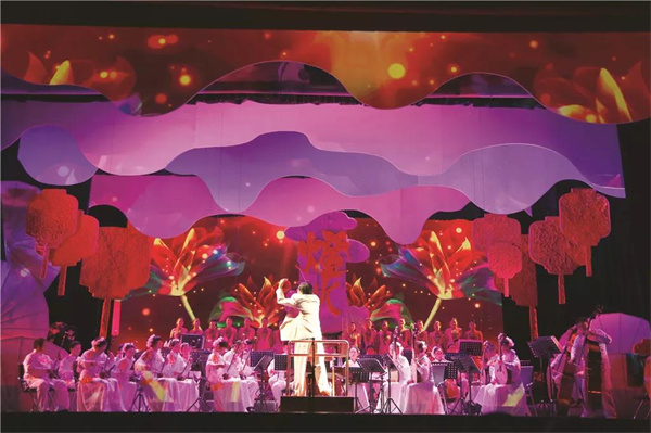 除主弦樂器,云南花燈還會(huì)使用色彩型樂器。色彩型樂器,通常指的是云南少數(shù)民族樂器,它們不作為主要樂器使用,在花燈配樂中起點(diǎn)綴的作用。戚異峰說:“色彩型樂器的音色、音質(zhì),個(gè)性特點(diǎn)突出。因?yàn)槠鋫€(gè)性特點(diǎn)突出,就會(huì)和其他樂器‘打架’,比如小三弦,它的穿透力很強(qiáng),十人組成的樂隊(duì),若有小三弦,很明顯就聽得出來。《鄭喇叭外傳》里面就有一段以小三弦為主的配樂,是根據(jù)它的音樂特色和劇情需求特別選用的。常見的色彩型樂器包括葫蘆絲、象腳鼓等,也會(huì)用到樹葉等。”