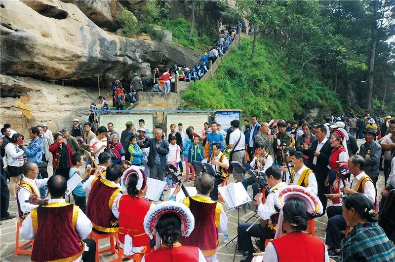 當地人介紹,以前每到歌會那天,去石寶山的小道上,人流如潮,宛如一條條五彩斑斕的長龍,完全像在趕一場廟會。參加歌會的白族姑娘略施粉黛,衣著光鮮,素白底衣上繡著精致的花紋,配以顏色亮麗的頭飾、圍腰等;白族小伙子胸前掛一架別致的龍頭三弦,著裝整潔筆挺,英俊帥氣。